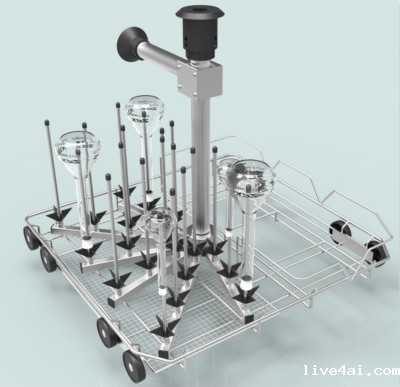 适用清洗试管、量筒、锥形瓶、球形瓶等,固定配备36支清洗柱,清洗柱有3种高度,分别为140mm,200mm,240mm;