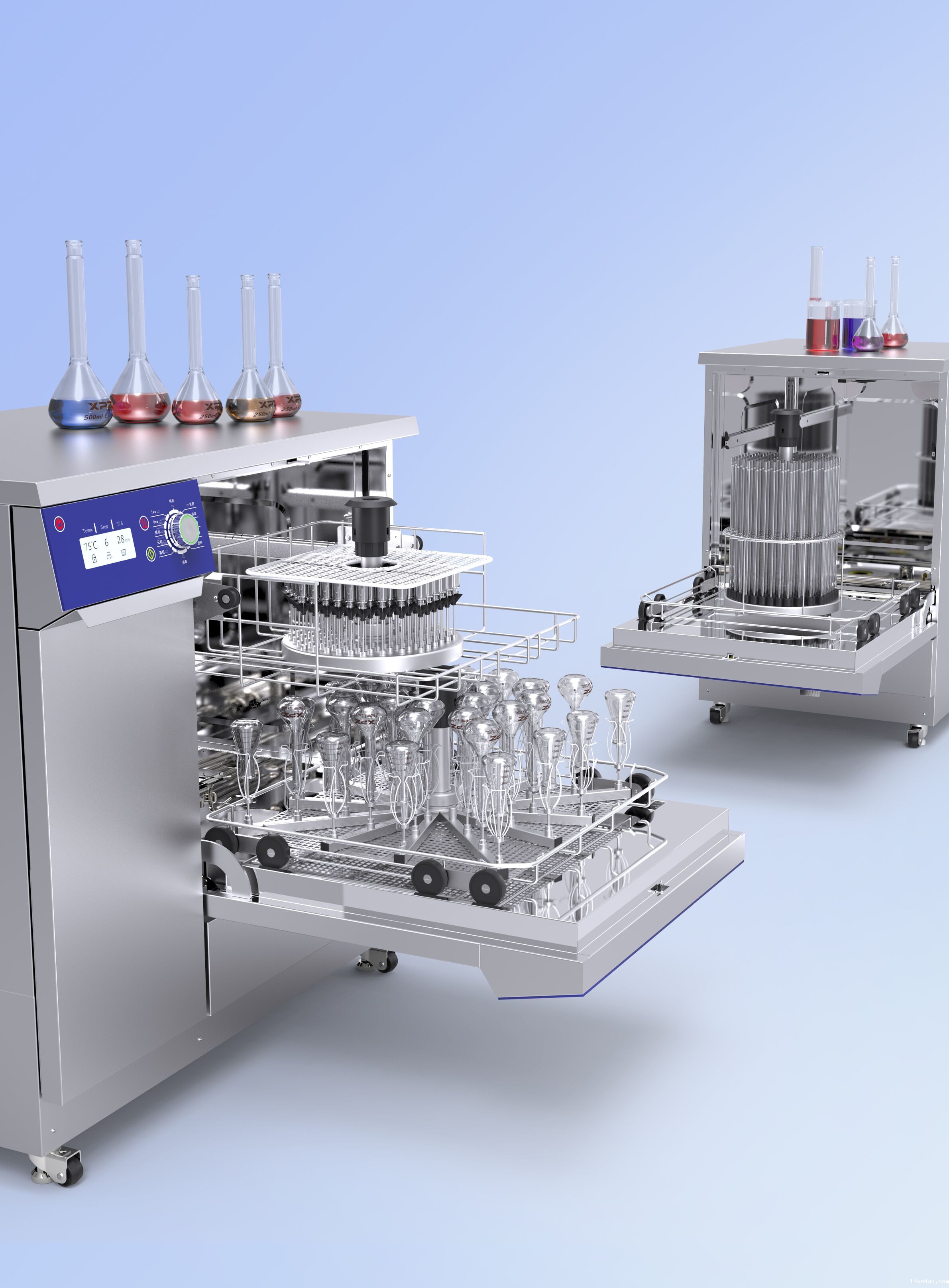 使用用途:用于实验室玻璃、陶瓷、金属或塑料等材质器皿的自动清洗及烘干,同时可以清洗实验室容量瓶,进样小瓶,广口瓶、三角瓶、量筒、鸡心瓶、比色管、培养皿等实验室器皿